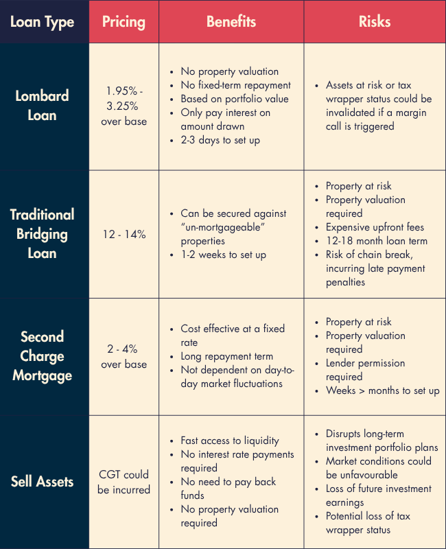 While property bridging and mortgages have their place and can very often be a favourable solution, for specific use cases where a property valuation isn’t possible, or a timeline for pay-back isn’t guaranteed, Lombard lending is a great alternative.